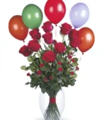Two dozen large red rosesroses in a clear glass vase with greenONLY and 12 assorted latex balloons.