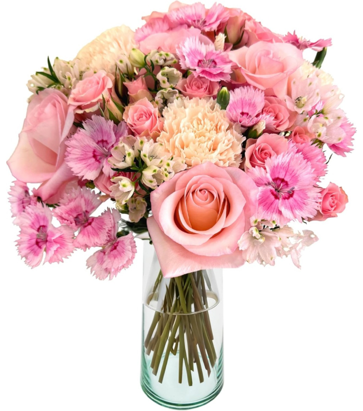 This hand-tied bouquet contains fresh-cut Pink and White Roses, Spray Roses, Mini Carnations, Hypericum, Carnations, and Mums in an elegant, hand-blown glass vase.