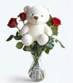 1 large while roses in a bud vase with few greens and filler and a white $15 bear. Bear’s arms are wrapped around the vase.