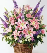 Stargazer Lilies, lavender roses, pink carns, liatris, bells of ireland, purple monte cassino aster, pink alstro, and a few greens arranged one-sided and tall in a basket