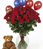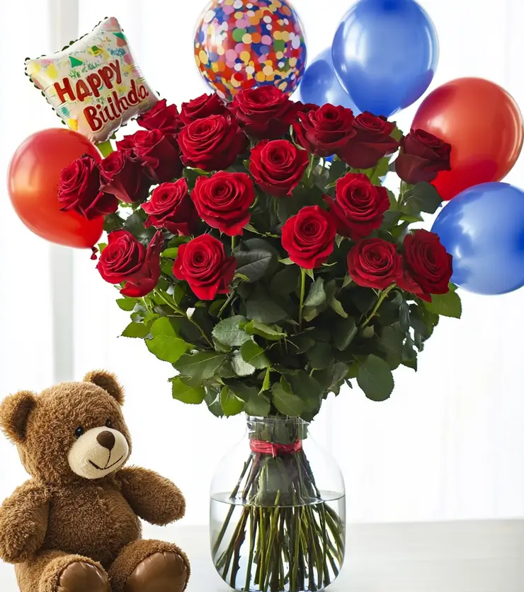 Two dozen large red roses roses in a clear glass vase with just greens, 2 Happy Birthday Mylars and 6 assorted latex balloons and a brown teddy bear for around $20.