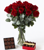 Eighteen red roses roses arranged in a vase with seeded eucalyptus and a $15 box of chocolates