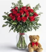 Express your delicate love with these beautiful roses and adorable cuddly bear. These roses are the perfect way to show your loved ones how much you care, and they will love receiving them as a special gift. The luxurious tone of these flowers will make them feel very special and loved.