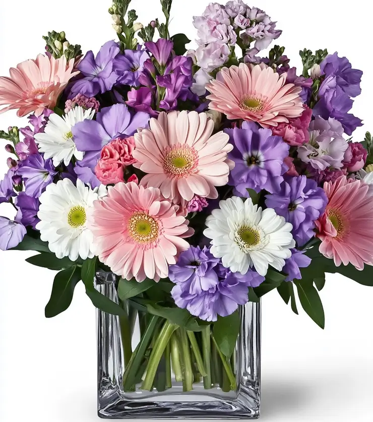 Pink, purple, and white flowers low and compact in a lavender glass cube. Roses, alstro, stock, carns, and daisies.