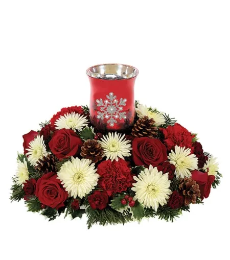 Exuberant, cheerful, beautiful. They all describe this bright and shimmering keepsake centerpiece that combines roses, carnations, poms and pine cones with a red candle holder featuring a festive snowflake.