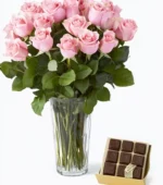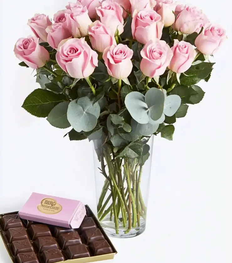 Eighteen pink roses roses arranged in a vase with seeded eucalyptus and a $15 box of chocolates