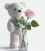 1 large pink roses rose in a bud vase with few greens and filler and a white $15 bear. Bear’s arms are wrapped around the vase.