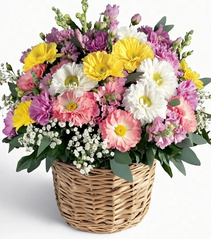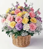 Send flowers with a touch of luxury to show your loved ones how much you care. Our basket of cheer is filled with pink, white, and purple carnations, making it perfect for any occasion.